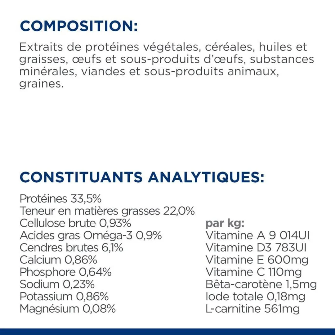 - Comporte un apport équilibré en acide gras Oméga 3 pour entretenir le pelage et la santé de la peau ;