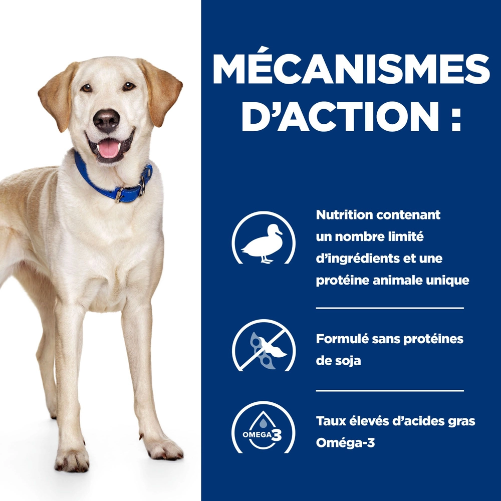 Hill’s PRESCRIPTION DIET d/d Aliment pour Chien au Canard & Riz est un aliment diététique complet en vue de la réduction des intolérances à certains ingrédients et nutriments et pour le soutien de la fonction cutanée en cas de dermatoses et de dépilations exacerbées chez le chien adulte. Cet aliment contient des teneurs élevées en acide linoléique (LA) et en acide eicosapentaénoïque (EPA) et en acide docosahexaénoïque (DHA) cumulés, ainsi que des sources de protéines et de glucides sélectionnées et en nombre limité.