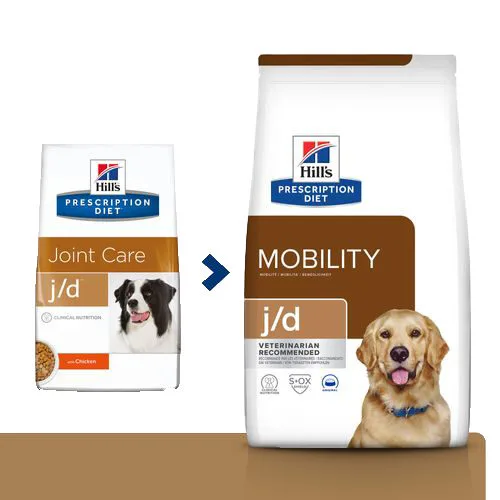 Hill’s j/d Prescription Diet Canine est une alimentation diététique spécialement conçue pour les chiens souffrant d’arthrite. Des études cliniques ont prouvé que cette alimentation aide à soulager les douleurs articulaires et améliore la mobilité du chien en 21 jours.